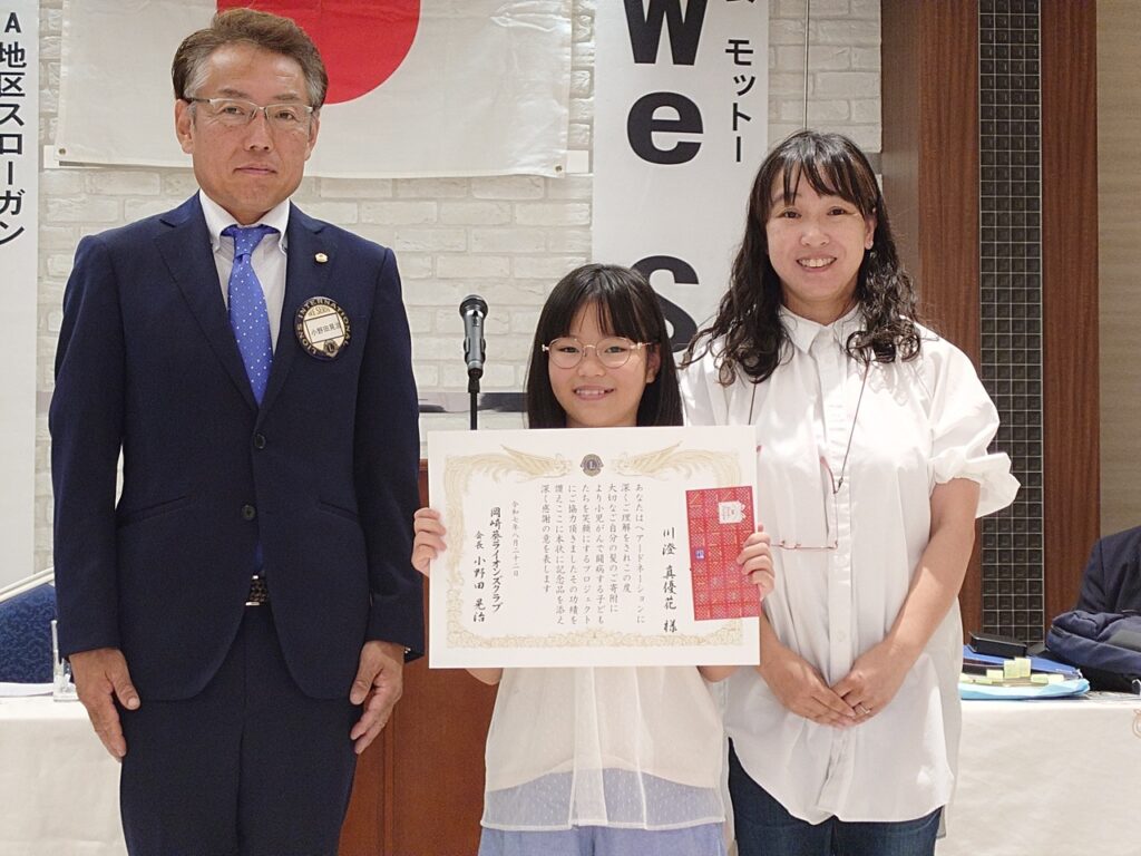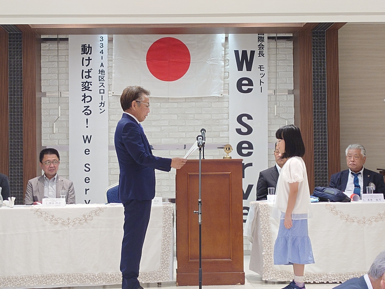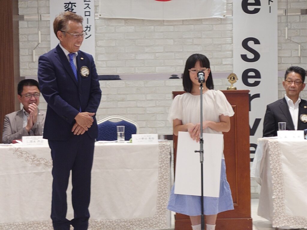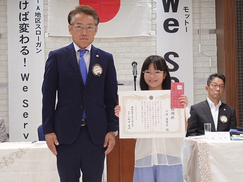 第1332回例会(地区役員訪問例会) 2025年8月22日 proof-editor 8月22日(金)12時30分~13時45分定例会場において、第1332回例会(地区役員訪問例会)が行われました。本例会では、毎年4R1Zゾーンチェアパーソンを始め、当地区の役員を来賓としてお招きして開催しております。また、今回はヘアドネーションに協力していただきました小学生の方に、当クラブから感謝状を贈呈させていただきました。