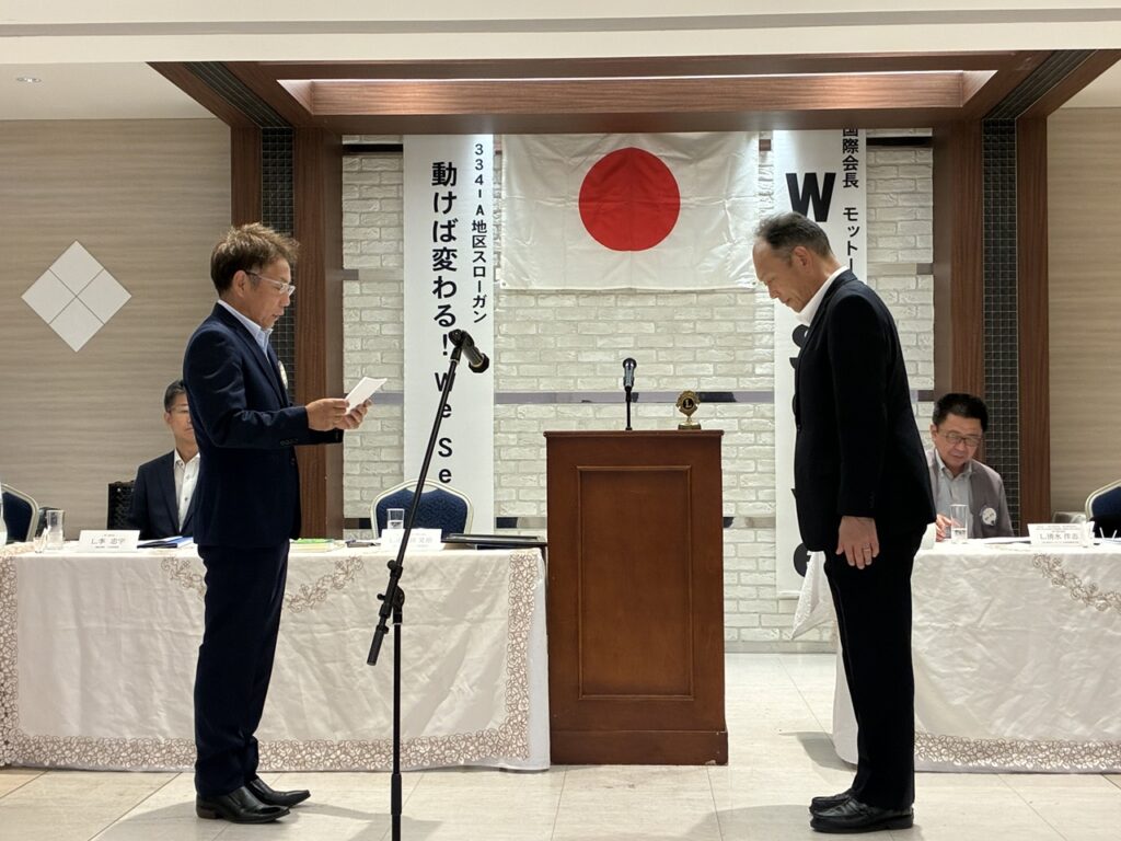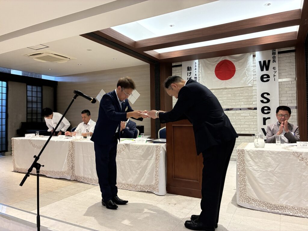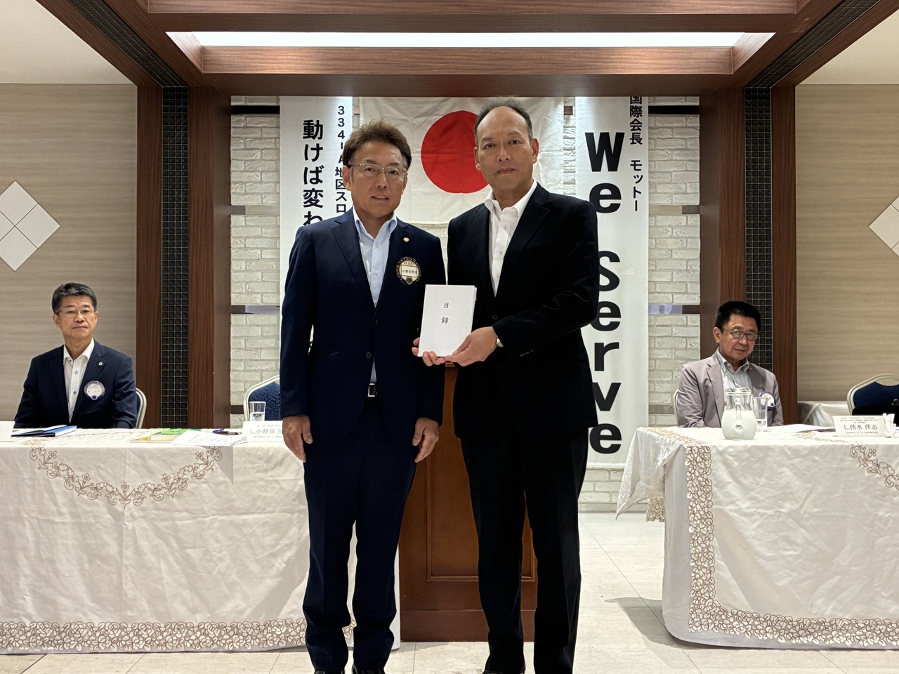 第1330回例会 2025年7月26日 proof-editor 7月25日(金)12時30分~13時45分定例会場において、第1330回例会が行われました。本例会では、岡崎市教育委員会へ助成金の贈呈を行いました。助成事業は下記のとおりです。・岡崎市中学生の主張コンクール・理科作品展・造形おかざきっ子展・岡崎市小中学生書き初め展また、本年度は当クラブよりゾーンチェアパーソン、地区マーケティング委員を輩出しております。その委嘱状の贈呈と各アワードの贈呈、誕生祝など、たくさんの行事を行いました。