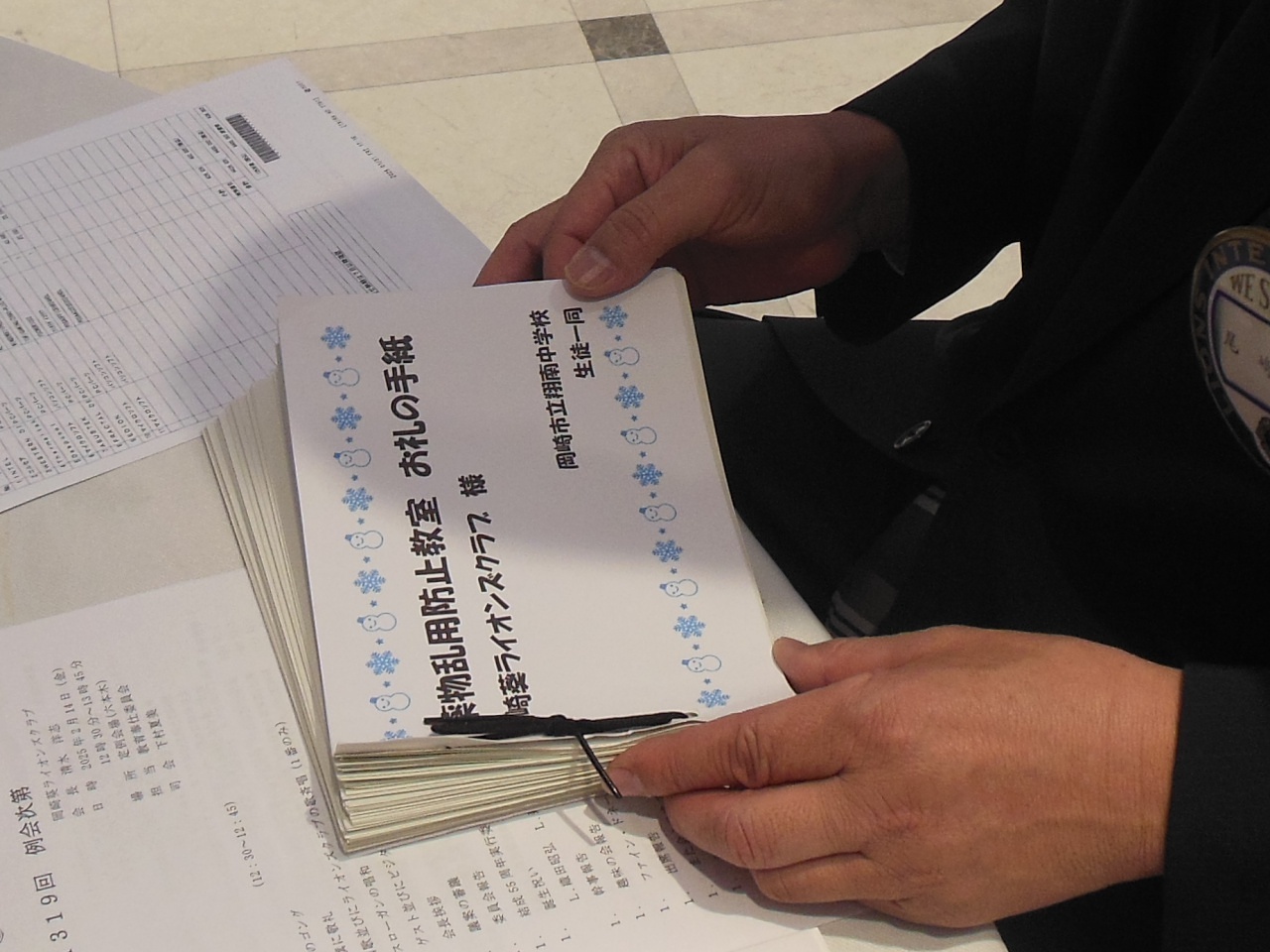 第1319回例会 2025年2月14日 proof-editor 2月14日(金)12時30分~13時45分定例会場にて第1319回例会が開催されました。今例会では、誕生祝がメインで行わました。また、12月16日に行いました翔南中学校での薬物乱用教室について、たくさんの生徒さんからお礼のお手紙をいただきました。今後の活動の励みになります。ありがとうございました。
